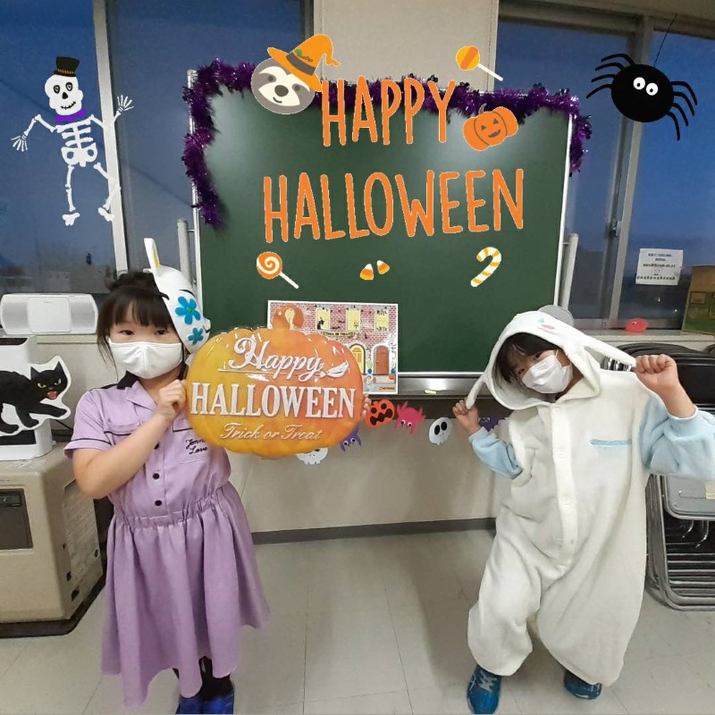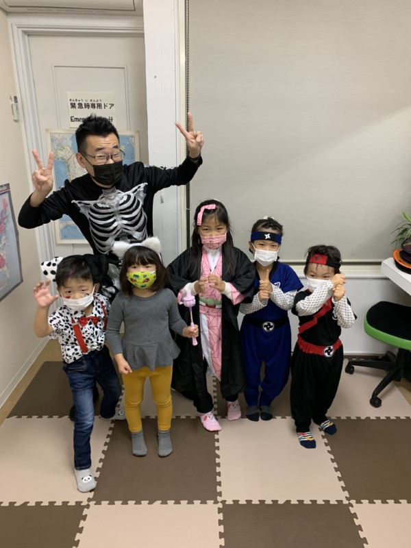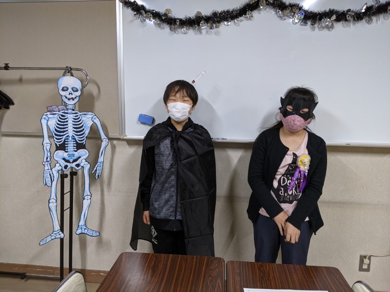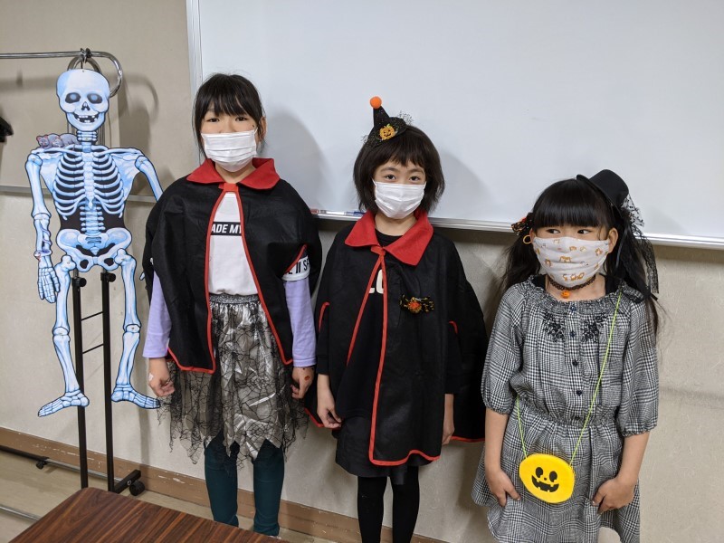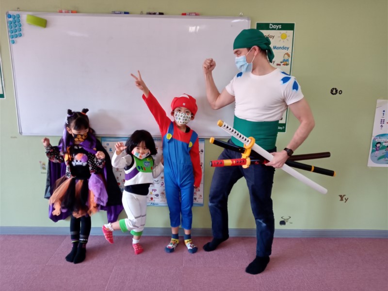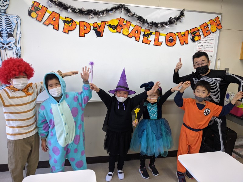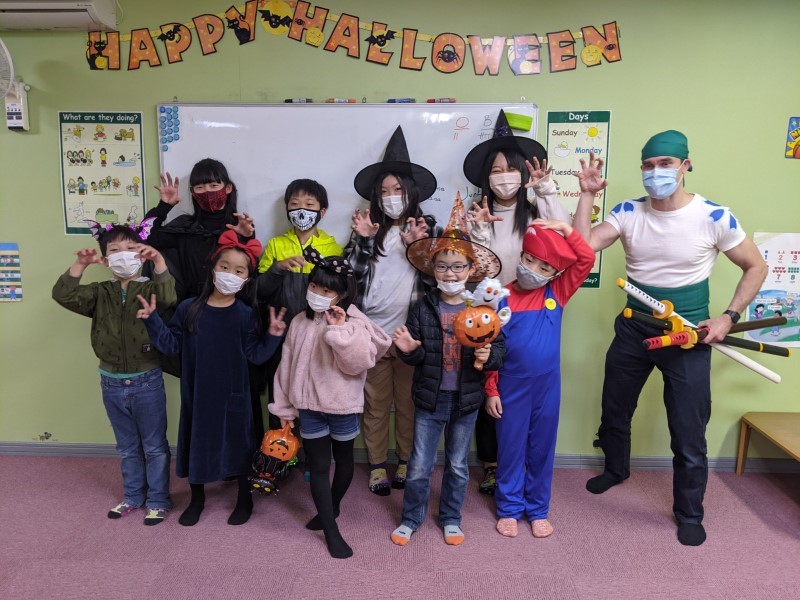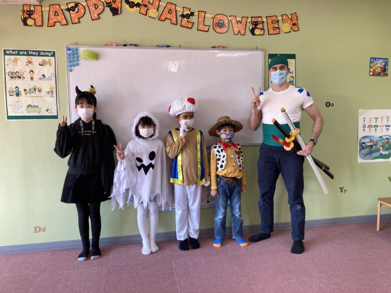 Happy Halloween, everyone! We hope you all had a fun time at our Halloween classes this year! Here are some pictures from some of our classes. Did you wear a costume? What were you this time? This year our teachers were a hedgehog, a skeleton and Roronoa Zoro from One-Piece!2年連続でハロウィン・フェスティバルは中止、という事で今年も教室で「ハロウィン・レッスン」を行いました。当日は幼児クラスから小学全学年まで、各クラス、先生も生徒もコスチュームを着て、ハロウィンに関する単語やフレーズを練習して、トリックオアトリートや、ゲーム、クイズ等で特別なレッスンを楽しんでもらいました。